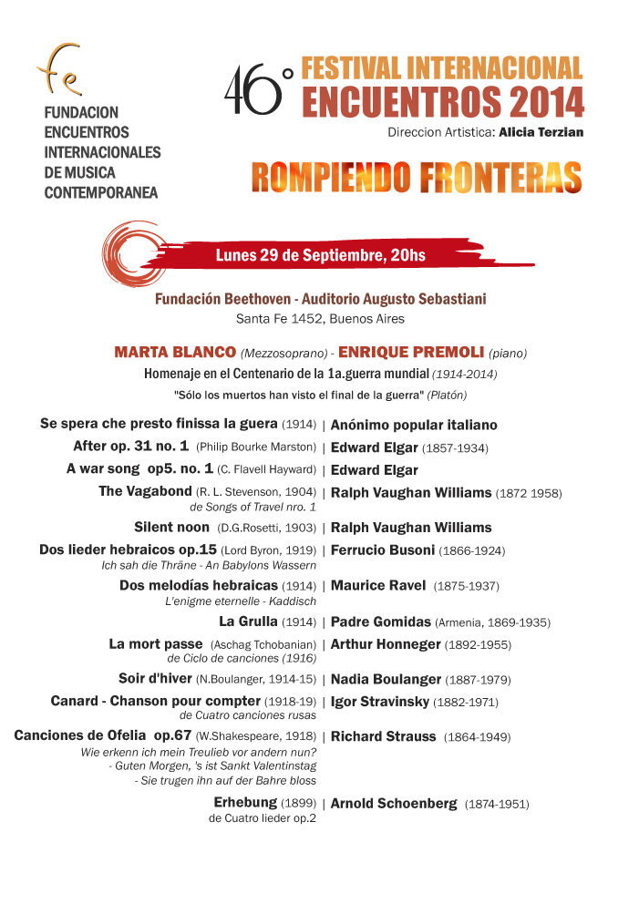 El 46º Festival Internacional Encuentros 2014 decidio recordar ésta fecha cerrando el Festival con un concierto dedicado a obras escritas,en la mayor parte , en esos terribles años por diferentes compositores .