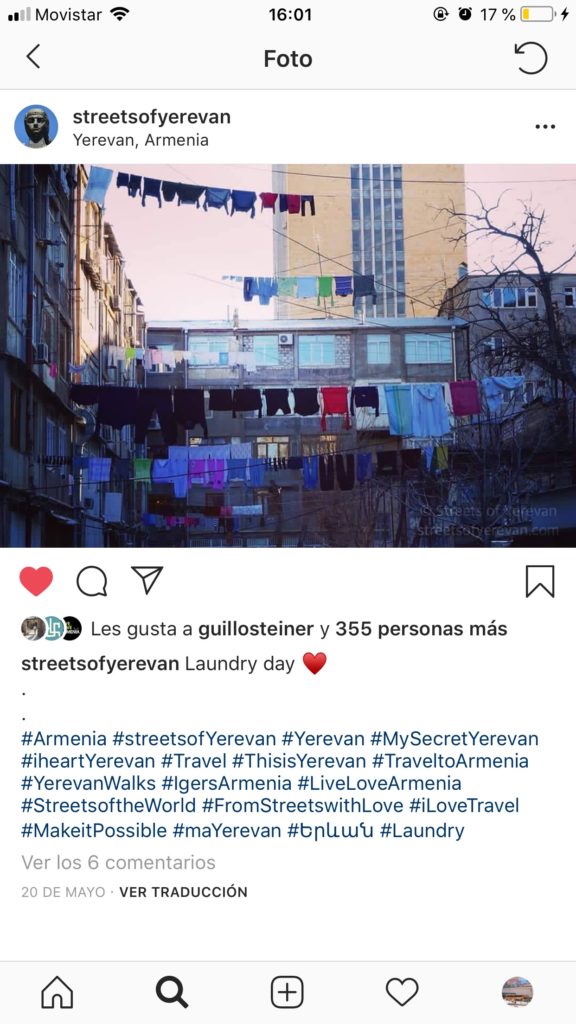 El plus que tiene @StreetsofYerevan radica en que vemos la ciudad a través de los ojos de una yerevantsí que ama su ciudad y que ha caminado esas calles desde que nació. Aquí no vemos sólo imágenes bonitas: se trata de los colores, los detalles, las formas y la vida de Yerevan. Anna conoce cada rincón, la particularidad de cada patio, la panadería que hace el mejor khachapurí o la puerta más antigua. Intenta compartir algo de esa magia que todos sentimos cuando estamos en Yerevan, esa que genera la brisa veraniega que corre entre los rayos de sol o esos copos blancos que caen del cielo cuando bajan las temperaturas. Y aunque una imagen valga más que mil palabras, también vale visitar la ciudad y tomar fotos desde la perspectiva de cada uno.