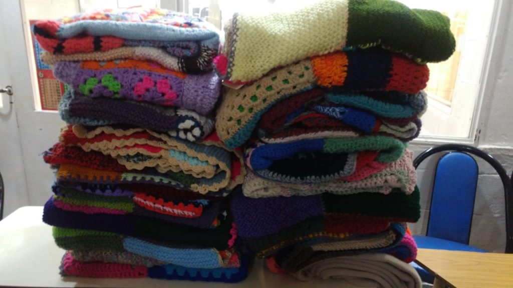 Antes de entrar a clases, los alumnos hicieron la apertura de las mantas en el patio del Instituto. Se pudieron ver más de 20 mantas, cosidas a partir de cuadradiltos. En esto se pudo ver resumido todo el trabajo en equipo de los padres y madres de todo el colegio -que tejieron los cuadraditos-, de los chicos de 4to grado -que hicieron la convocatoria y la recolección, de sus docentes y de la Comisión de Madres -que coordinó la actividad y unió los cuadraditos.