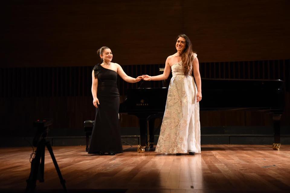 El concierto comenzó con las seis danzas para piano, interpretadas por la pianista armenia Marianna Abrahamyan. Con Marianna al piano, entró en escena la voz de la mezzo soprano argentina-Armenia, Solange Merdinian, que interpretó Shogher Jan, Aj, maral jan y Gakavig, y Oror a capella.