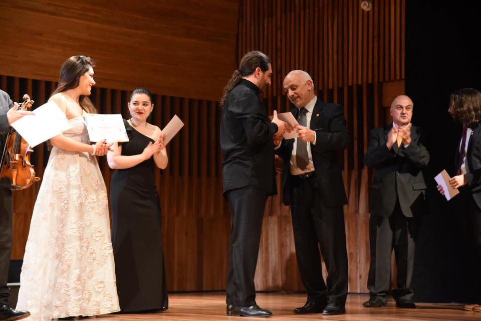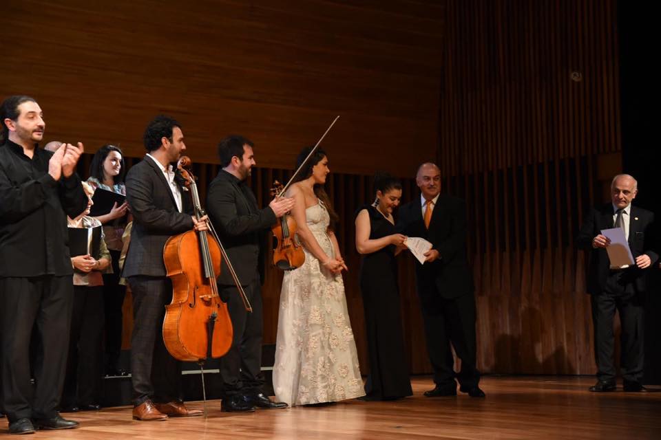 Rubén Kedikian, presidente de la UGAB Buenos Aires, y Adolfo Smirlian, miembro del Consejo Directivo, hicieron entrega de diplomas para los músicos, el coro y el director del CCK, Gustavo Muzzi. Kedikian aprovechó para agradecer la presencia de todos y disculparse, en nombre de la organización, por quienes no pudieron presenciar el concierto a causa de la rapidez con la que se agotaron las entradas y las estrictas normas de capacidad del CCK. Además resaltó la satisfacción de poder traer la música milenaria armenia a una sala tan prestigiosa como la del Centro Cultura Kirchner, que se logró después de meses de trabajo junto a la comisión de cultura de nuestra institución, encabezada en este caso por Adolfo Smirlian y lo excepcional de haber podido disfrutar estos músicos de tanta calidad que jerarquizaron el espectáculo y eligieron un cuidado repertorio para interpretar, juntos, la obra inmortal del Padre Komitás.