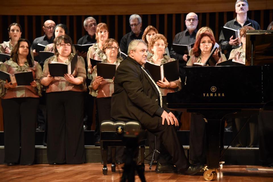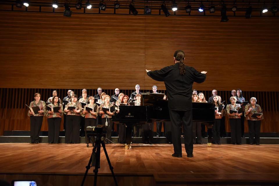 El último bloque de concierto estuvo a cargo del Coro Grung de la UGAB Montevideo, dirigido por el Maestro Alvaro Hagopian. Fiel a su estilo, el director explicó y contó una breve historia de cada pieza, que puso en contexto, al público, acerca del valor cultural de estas obras. Interpretaron piezas litúrgicas originales para coros masculinos, arregladas para coro mixto por el mismo Mtro. Hagopian. Acompañó en el piano Alejandro Sarkissian. Hacia el final, el coro nos regaló una perlita que vincula al homenajeado Komitás, con la UGAB. “Al conformar el programa, nos acordamos de esta obra de Komitas. En los festejos del quinto aniversario de la UGAB, en Alejandría, Vahakn Malezian, secretario general de la UGAB en ese entonces, le encomienda a Komitas la creación del himno de la institución”, cuenta Alvaro Hagopian, que muestra una carta con las recomendaciones de Komitas sobre el himno: “debe ser breve, conciso, de lenguaje popular y accesible. Cuanto más simple más sublime será”, decía. Finalmente, según fuentes, Komitás se demora tanto con la entrega del himno, que las autoridades de la institución deciden hacer uno por cuenta propia, que es el que se utiliza actualmente. “Hoy se hará justicia”, dijo Alvaro despertando las ovación del público, ya que este himno es la primera vez que se escucha en Sudamérica.