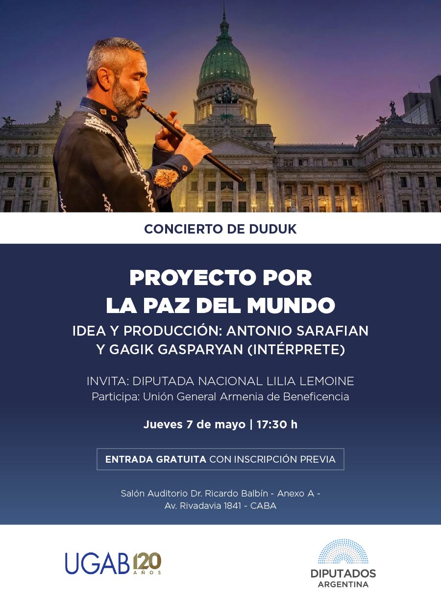 En el año del 120 aniversario de la fundación de la Unión General Armenia de Beneficencia y coincidiendo con el día en que celebramos los 115 años de la Filial Buenos Aires, junto a la Dirección de Cultura, Museo y Extensión Federal de la Cámara de Diputados de la Nación los invitamos a presenciar un espectáculo único del destacado músico Gagik Gasparyan, especializado en duduk armenio.